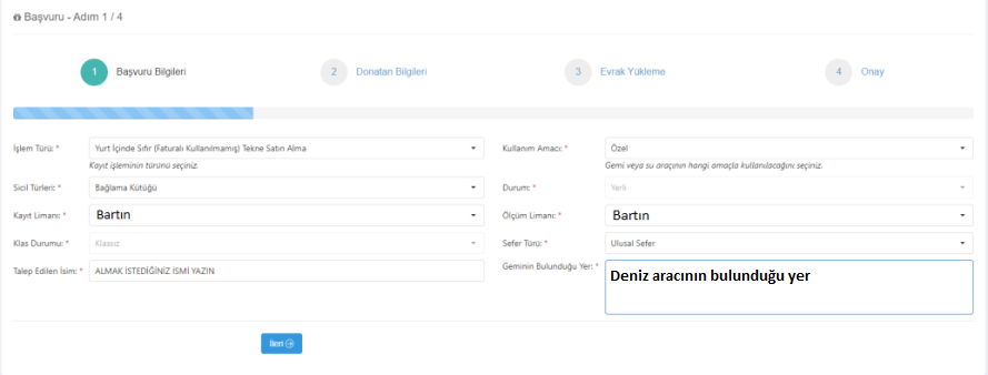 Donatan bilgilerinin bulunduğu 2. Sayfaya geçiş yapılabilmiş ise sistemden çıkış yaparak teknenizin iskele ve sancak baş omuzluklarına ve kıç aynasına yukarıdaki isim kriterlerine uygun olarak isim yazılmalı, ayrıca kıç aynasına tercih ettiğiniz kayıt limanı ismi “BARTIN” şeklinde yazılarak evrak yüklemesi istenilen 3. Sayfada belirtildiği gibi fotoğraflar hazırlandıktan sonra hiç müracaat edilmemiş gibi yeniden giriş yapınız.