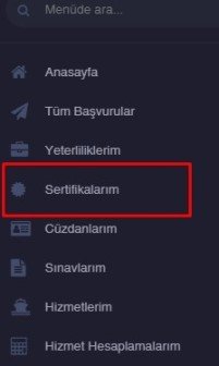 - Sonrasında eğitimi alınan ve talep edilen sertifikalar için başvuru yapmak üzere sayfanın sol tarafındaki menüden SERTİFİKALARIM yazısına tıklanır