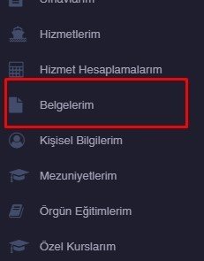 - Sistemde yer almayan özellikle 2008 öncesine ait ilk, orta ve lise öğreniminize ilişkin bir belge talep edildiğinde belgeyi sisteme girince sol tarafta yer alan menüden BELGELERİM yazısına tıklayarak açılan sayfadan sisteme yüklenebilir