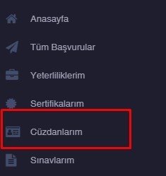 adreslerinden sisteme e-devlet yoluyla giriş yapılır. Açılan ana sayfanın sol tarafındaki menüden CÜZDANLARIM yazısına tıklanır.