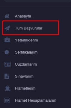 Son olarak ekranın sol tarafındaki menüden "TÜM BAŞVURULAR" yazısına tıklanır.