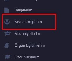 Sisteme giriş yapıldıktan sonra sayfanın sol tarafındaki menüden "KİŞİSEL BİLGİLERİM" yazısına tıklanır