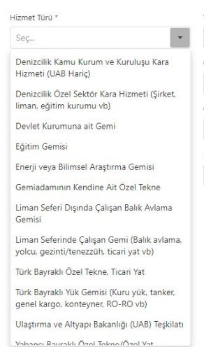 - Açılan pencerede Hizmet Türü kısmında çalışılan geminin uygun olduğu seçenek seçilir.