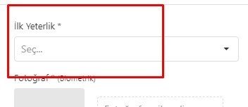 - Sayfanın ortasına yeni bir pencere açılacaktır. Pencerenin sol üst kısmında yer alan "İlk Yeterlik" yazısının altındaki kutucuğa tıklanarak açılır listeden başvurulmak istenen yeterlik seçilir