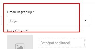 - Sonrasında yine açılan pencerenin sağ üst tarafında yer alan "Liman Başkanlığı" yazısının altındaki kutucuğa tıklanarak açılan listeden ikametgaha en yakın olan Liman Başkanlığı seçilir