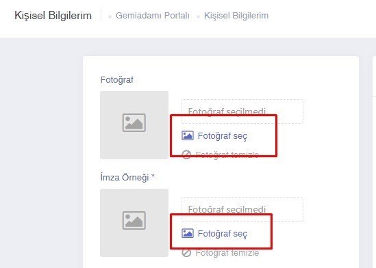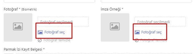 Açılan sayfada fotoğraf ve imza örneği yazan kısımdaki "Fotoğraf seç" yazısına tıklanarak sisteme fotoğraf ve imza örneği yüklemesi yapılır