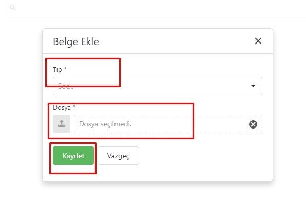 - Açılan pencereden sırasıyla belge tipi seçilir, dosya kısmından yüklenecek dosya seçilir ve en altta yeşil kutucuk içinde yer alan KAYDET yazısına tıklanarak belge sisteme yüklenir.