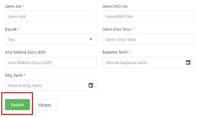Sonrasında hizmet belgesindeki bilgilere göre gemi adı, varsa IMO numarası, geminin bayrağı, brüt tonajı, makine gücü ve gemideki hizmetin başlangıç ve bitiş tarihleri gibi bilgilerin girişi yapılır ve Kaydet yazısına tıklanarak hizmet sisteme kaydedilir.