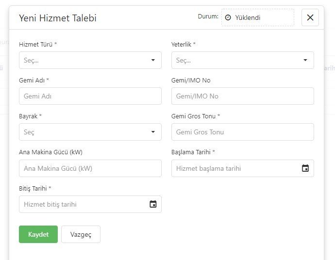 Karada veya denizde olması fark etmeksizin denizcilikle ilgili tüm hizmetler sisteme HİZMETLERİM sayfasının sağ üst köşesinde yer alan +Yeni Hizmet Talebi yazısına tıklanarak açılan pencere üzerinden bilgi girişi ve belge yüklemesi yapılarak gerçekleştirilir
