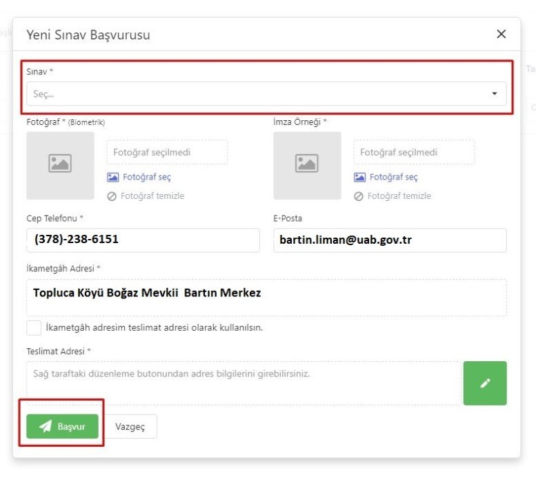 Alt kısımda yer alan fotoğraf, iletişim ve adres bilgileri daha önceki aşamada işlendiği şekilde gelecektir, tekrar işlem yapılmasına gerek yoktur. Son olarak en alttaki "Başvur" yazısına tıklanır